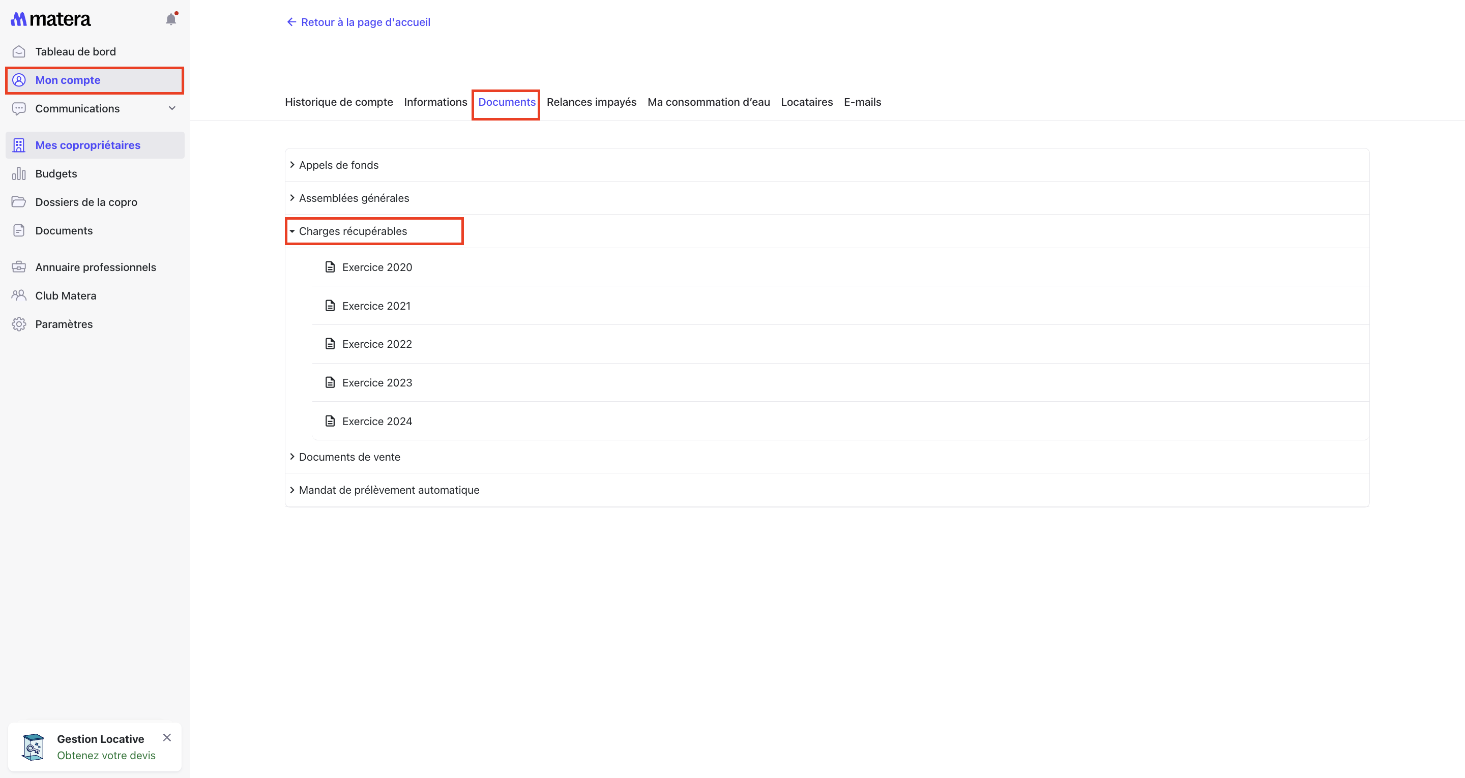 dans l'onglet Mon compte > Documents > charges récupérables.