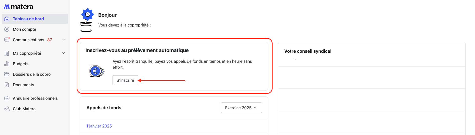 Sur votre tableau de bord, si votre gestionnaire a activé cette possibilité, vous pourrez vous inscrire au prélèvement automatique.
