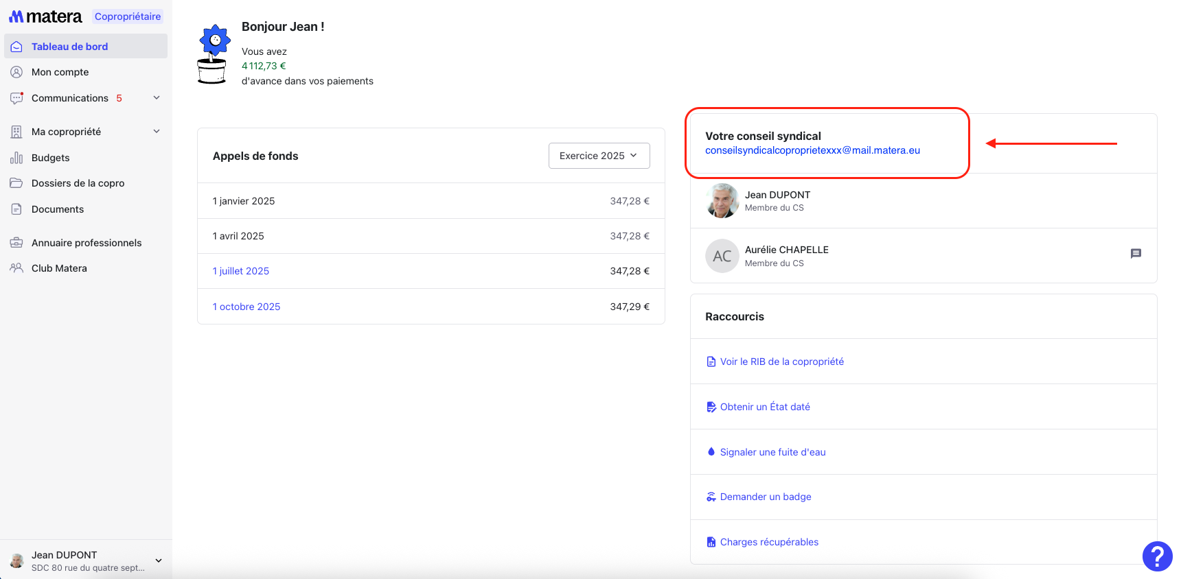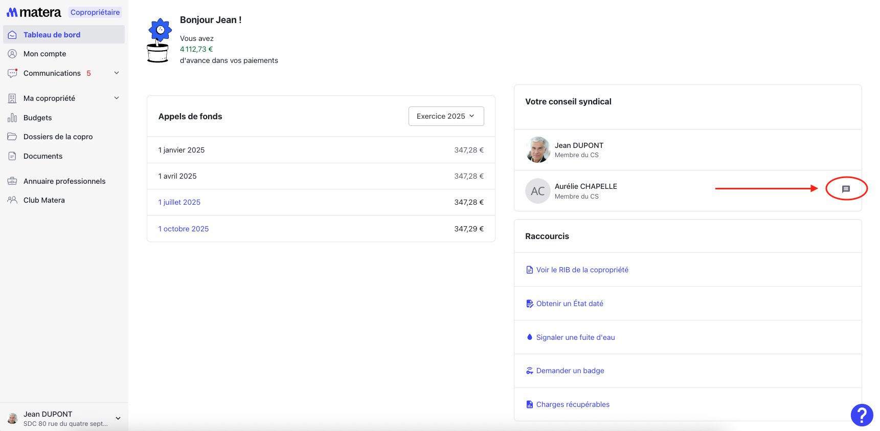 Sur votre tableau de bord, à droite se trouve la liste des membres du Conseil Syndical, un petit bouton vous permet de contacter l'un d'entre eux.