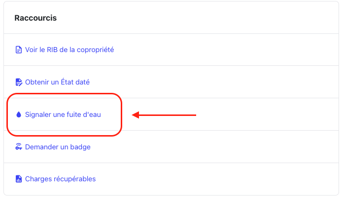 Une fois la recherche de fuite (RDF) effectuée, signalez votre sinistre au Syndic en utilisant le bouton "Signaler une fuite d'eau" disponible sur votre tableau de bord :