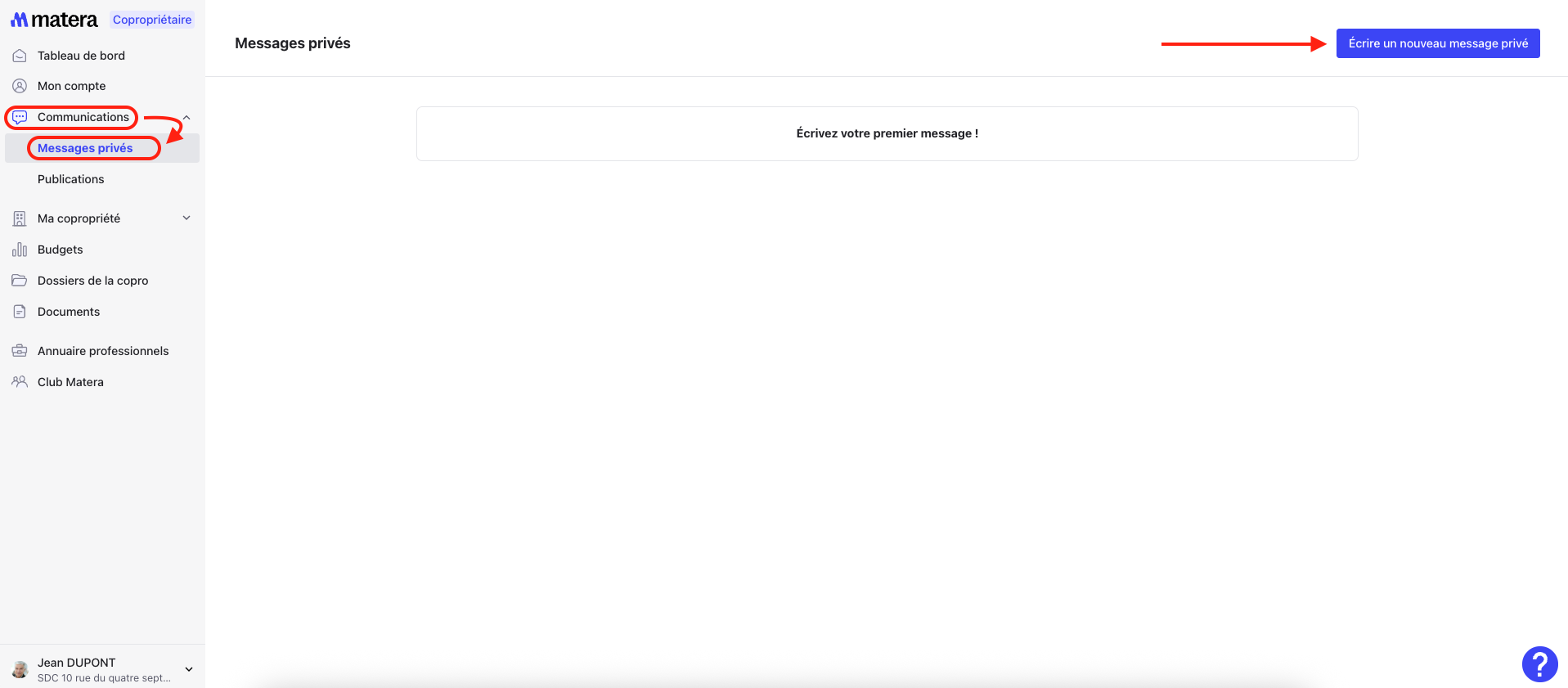 Sur votre espace Matera, vous pouvez écrire à votre Conseil Syndical ou à vos voisins (individuellement ou non) :