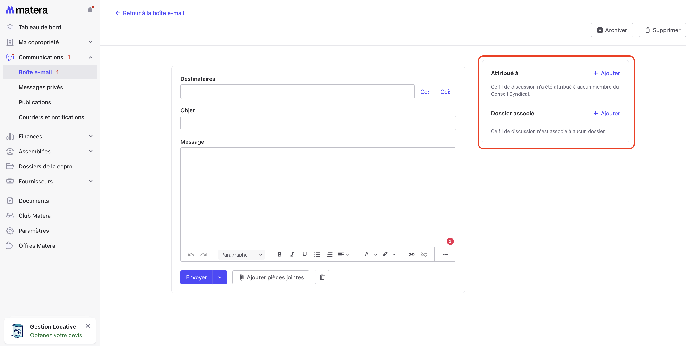 Ces fonctionnalités vous permettent de gérer facilement vos échanges liés à la copropriété, directement depuis votre espace Matera.