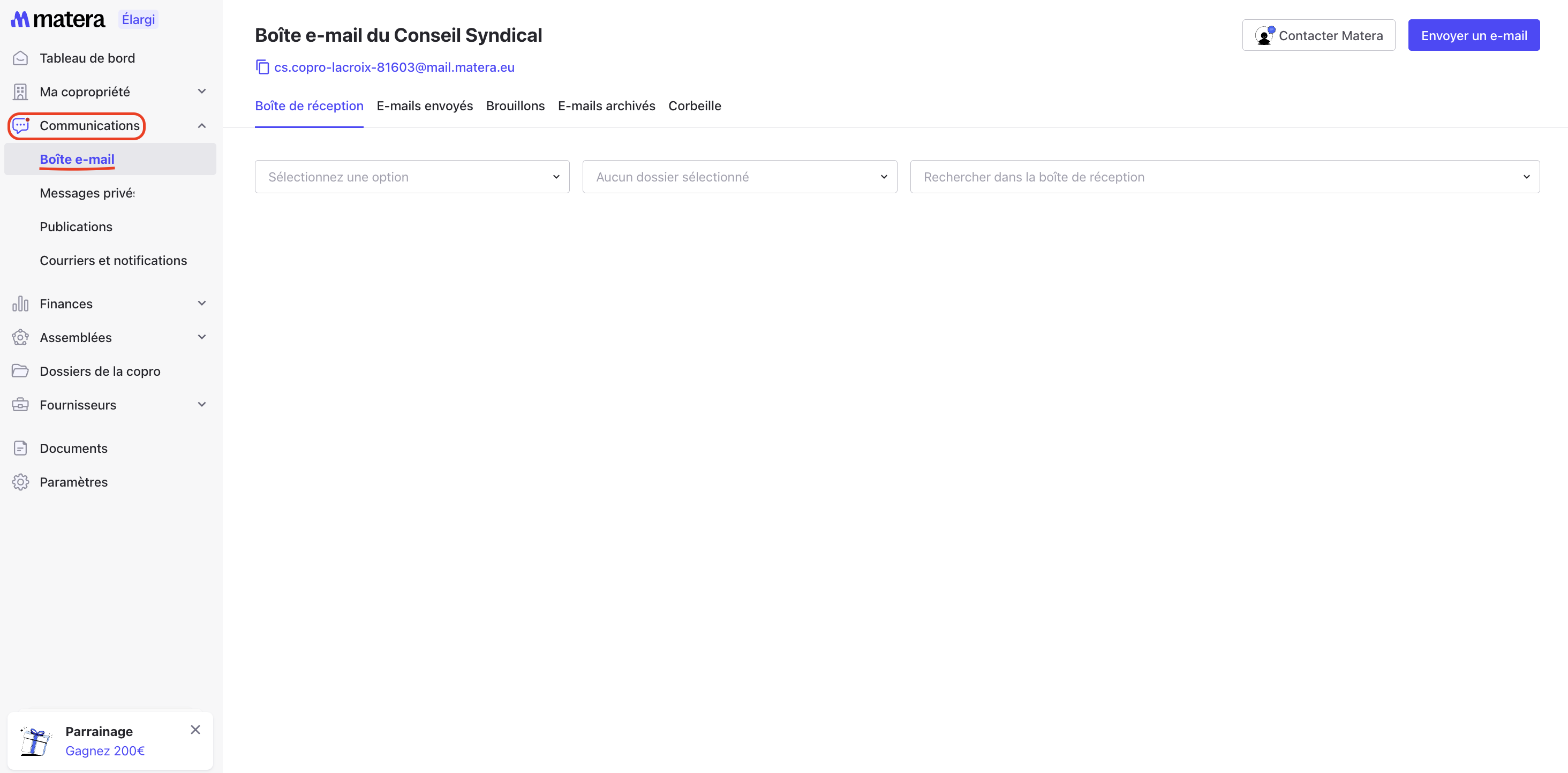 La mailbox Matera, ou boîte e-mail du Conseil Syndical, est accessible uniquement aux copropriétaires disposant d'un "accès Élargi", ainsi qu’au gestionnaire de la copropriété.
